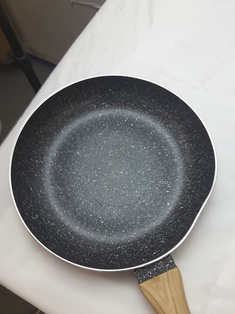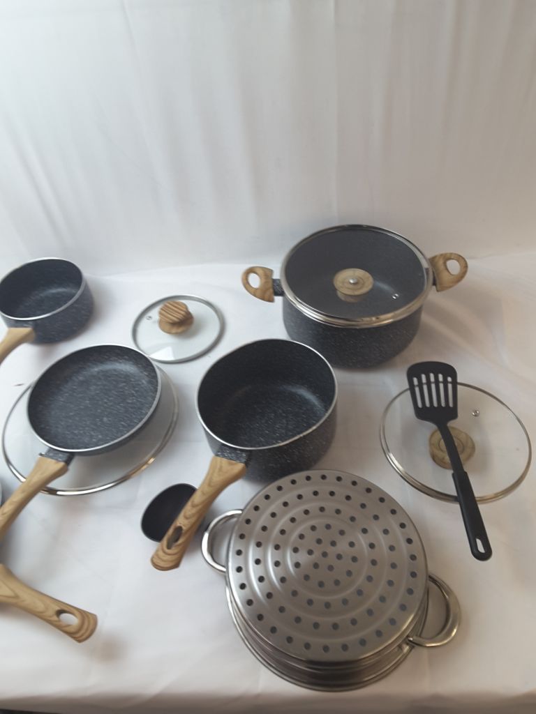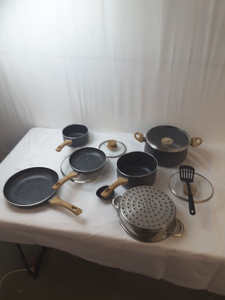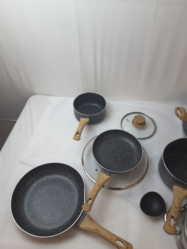 Most of the set is in great condition, but one of the pans is bent, comes with 6 different pans, color:black