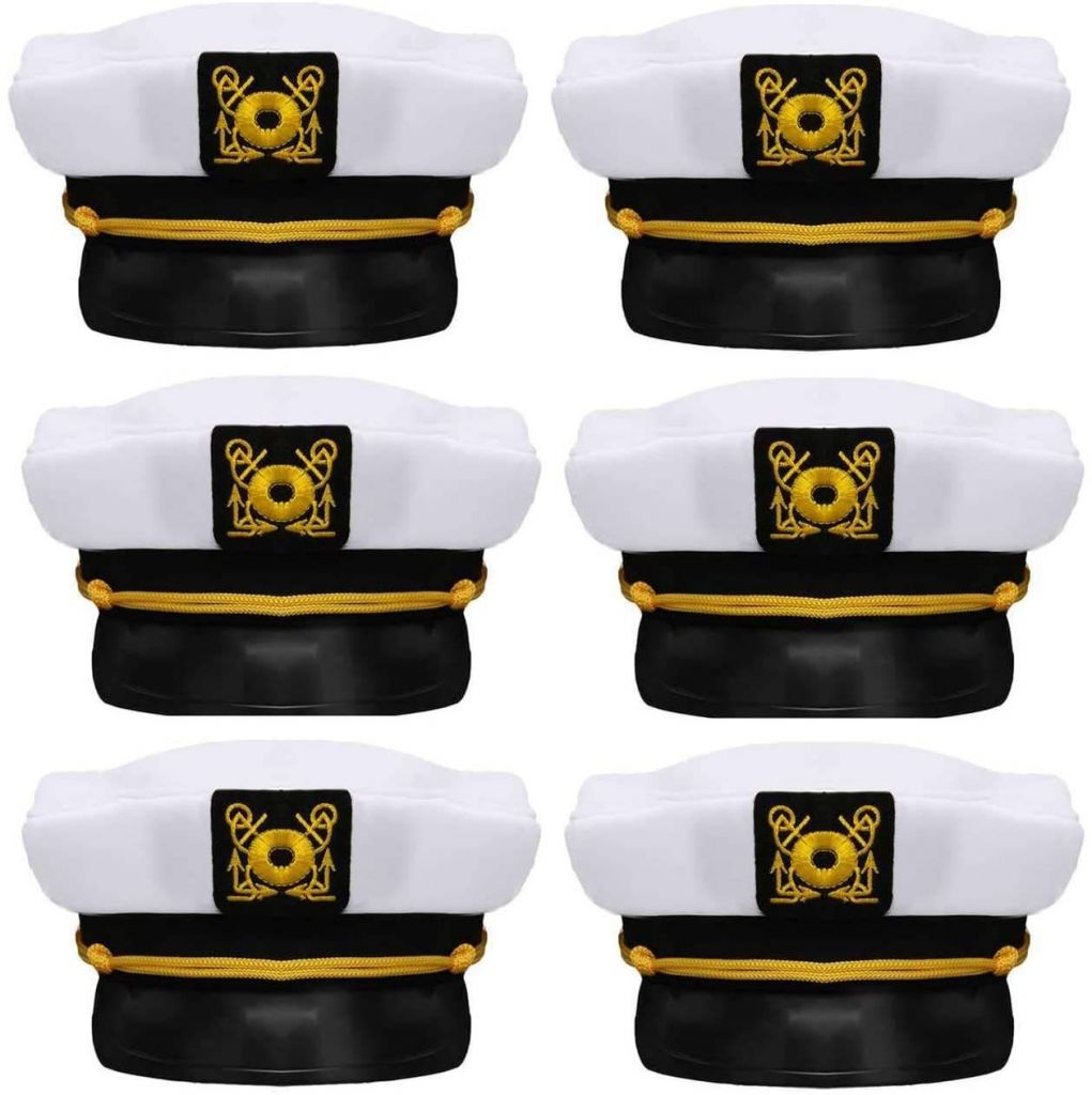 6 Pack White boat hat, yellow lining above the cap, anchor design detailing. For Summer Beach Sea Party Accessory, Cruise Ship, Yacht Boat Party, Captain Costume Hat,