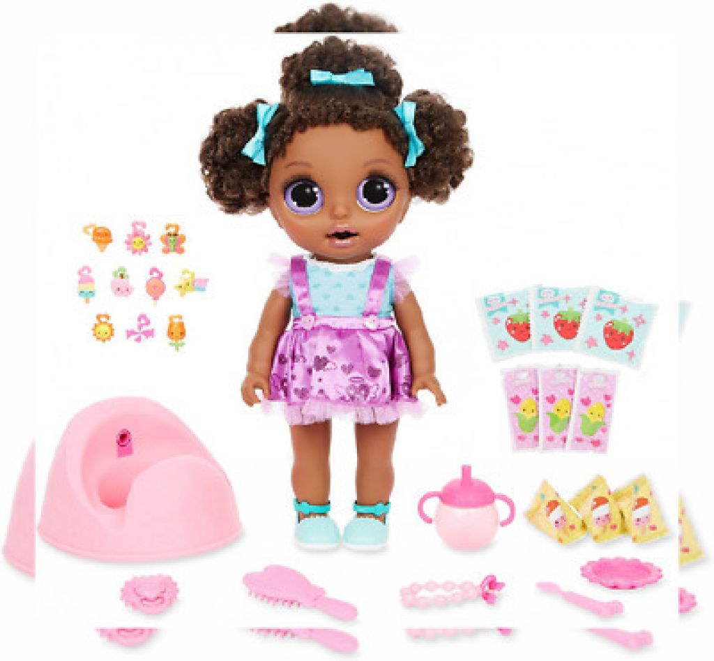 She eats her doll food, drinks her water & goes potty to reveal surprises.