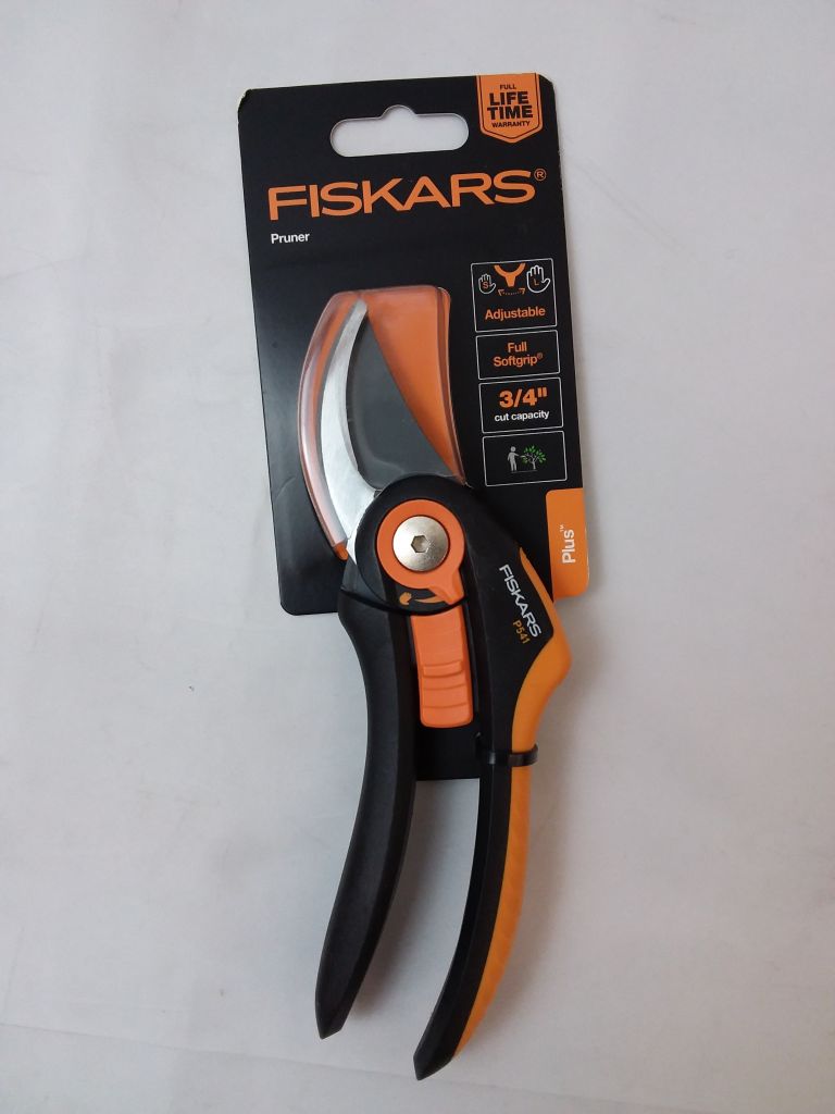 The lightweight Fiskars® Plus™ Pruner (P541) has a SmartFit™ lever to adjust how wide the pruner opens for easy pruning of stems and branches.