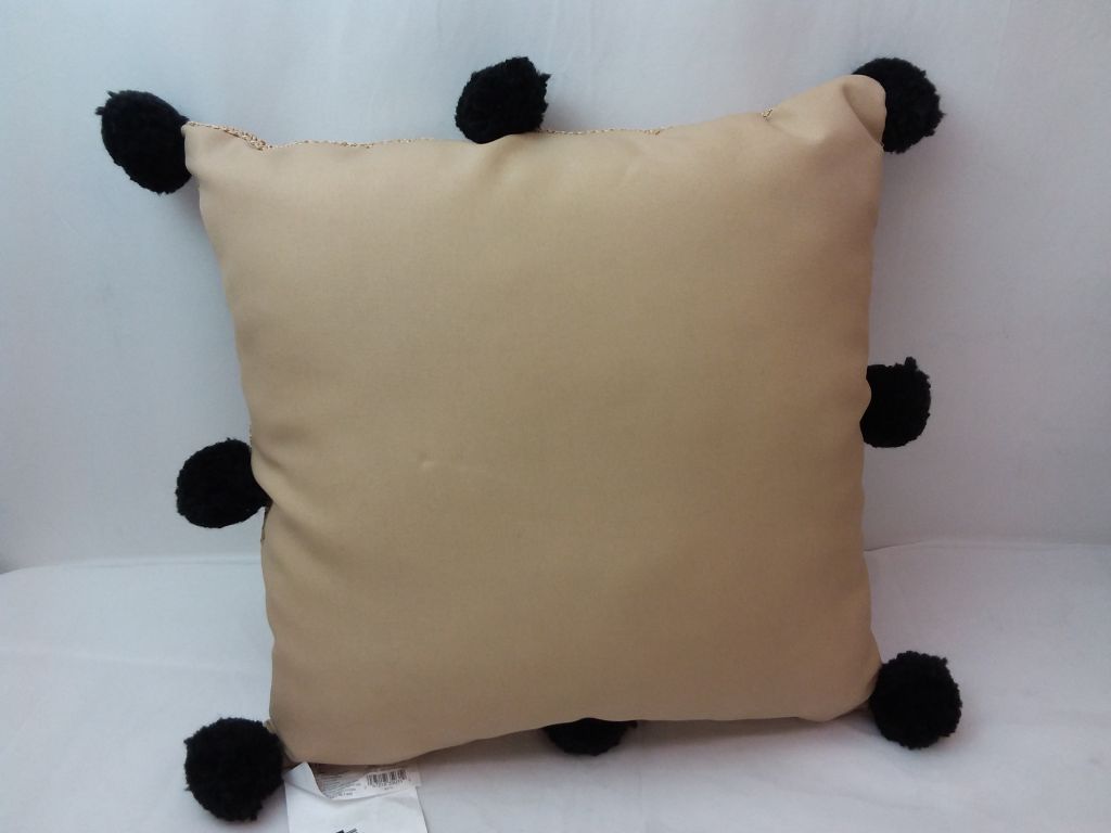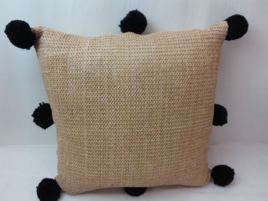 This 18-inch square throw pillow has a wavy textured surface in light brown, which contrasts beautifully with the fluffy black pompoms along the entire periphery for a designer look.
