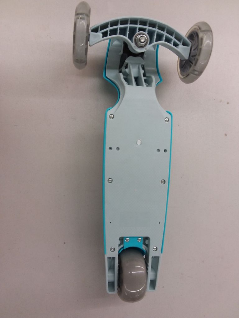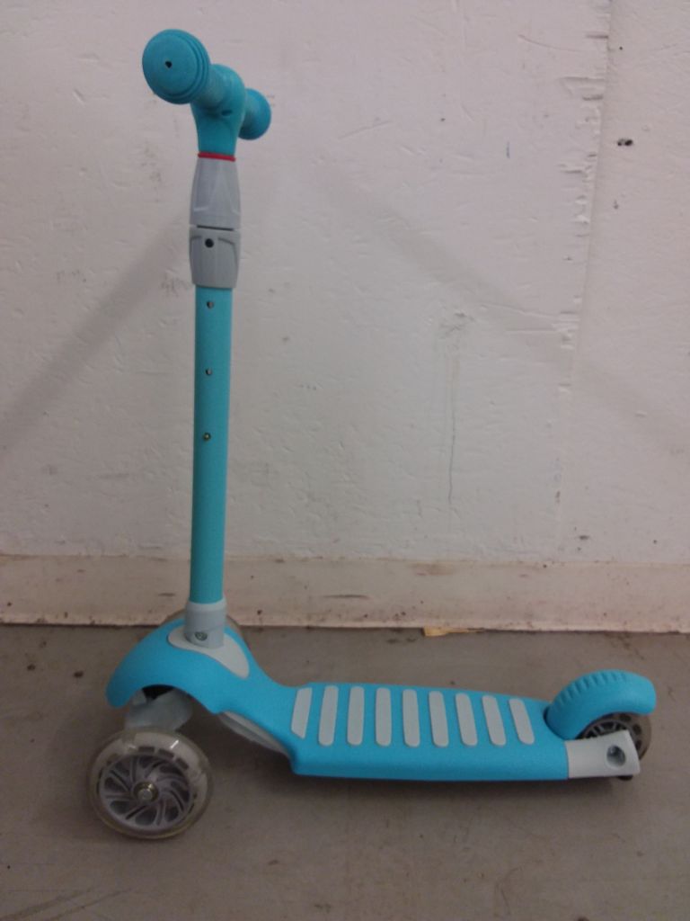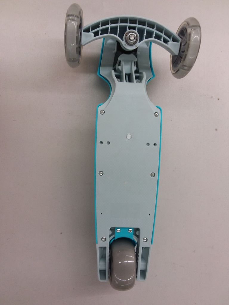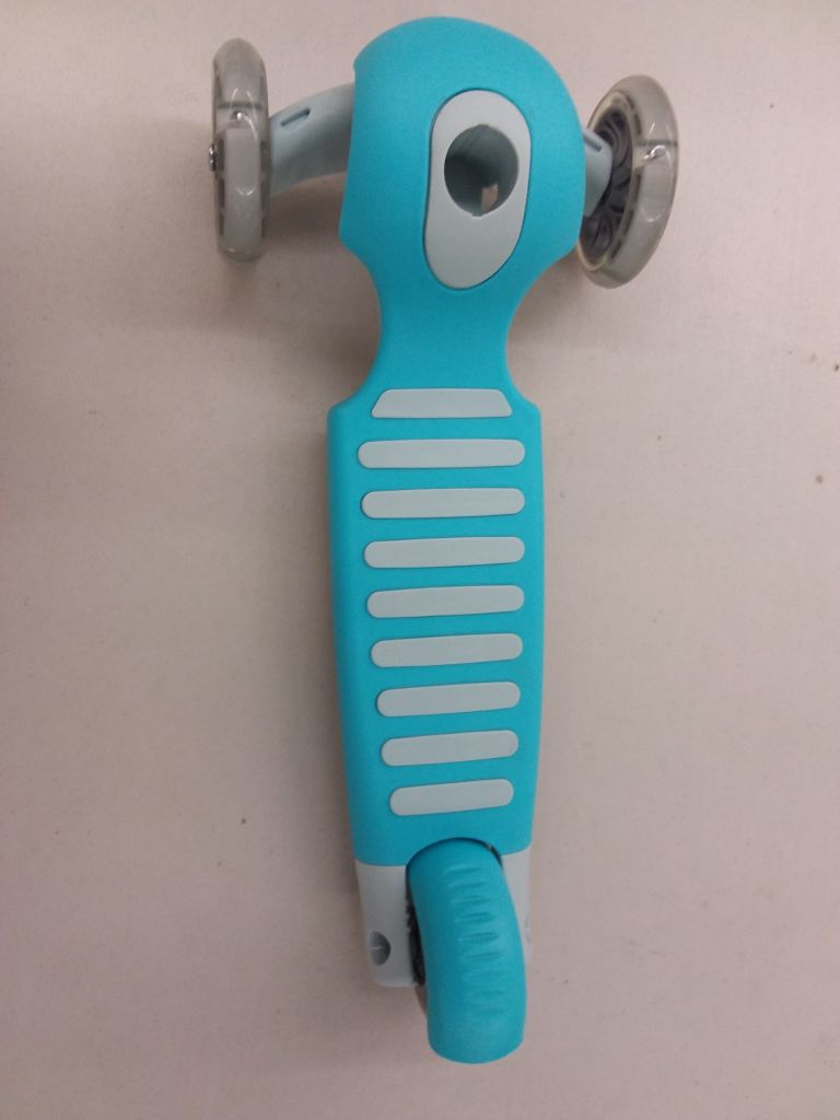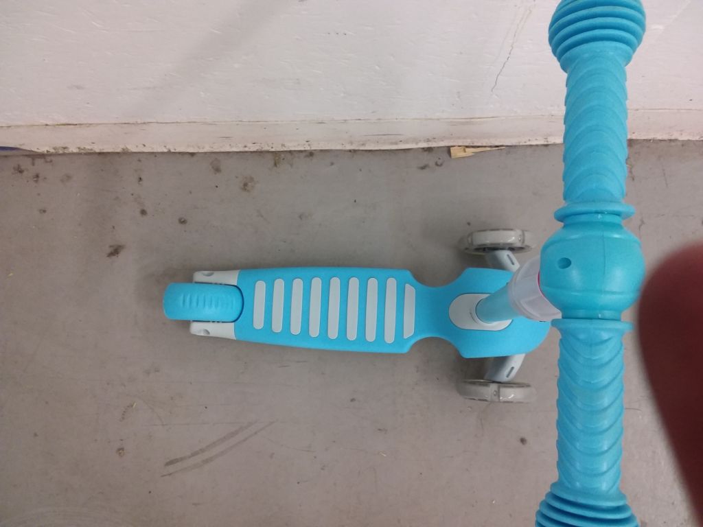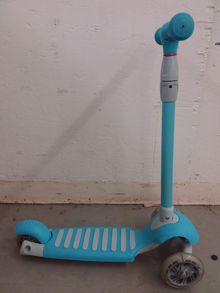 Blue and grey scooter, Soft non slip grip handle, quick release fastener, locking button, non skid deck