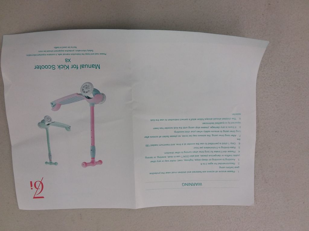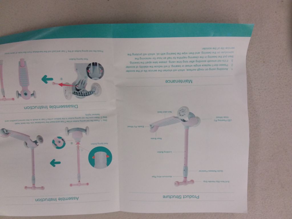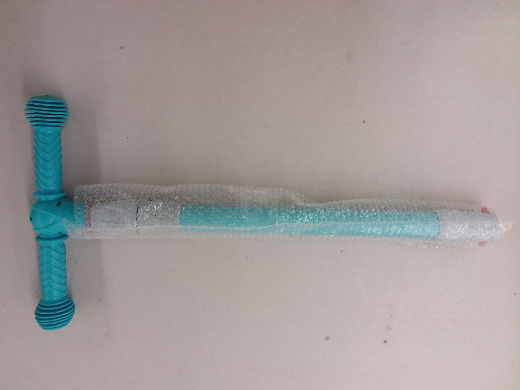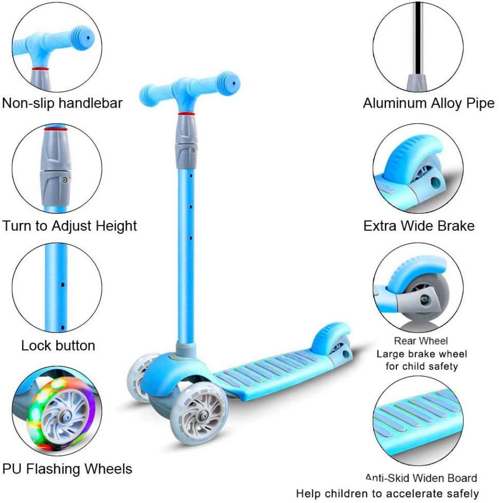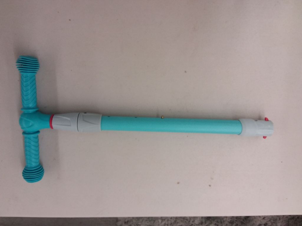 Blue and grey scooter, Soft non slip grip handle, quick release fastener, locking button, non skid deck