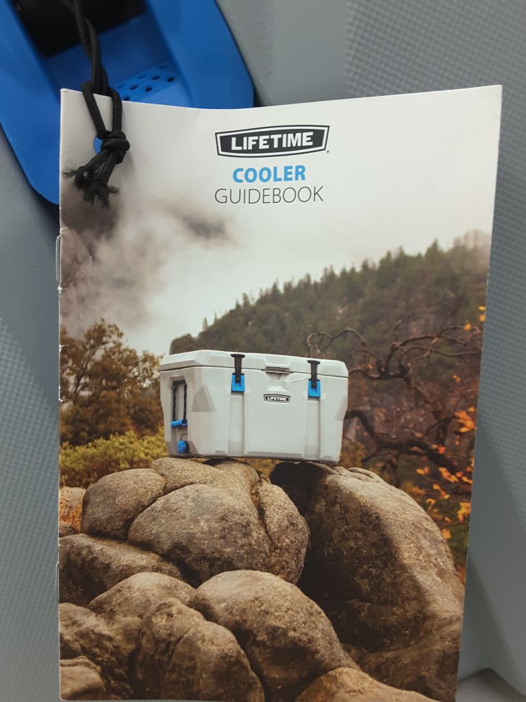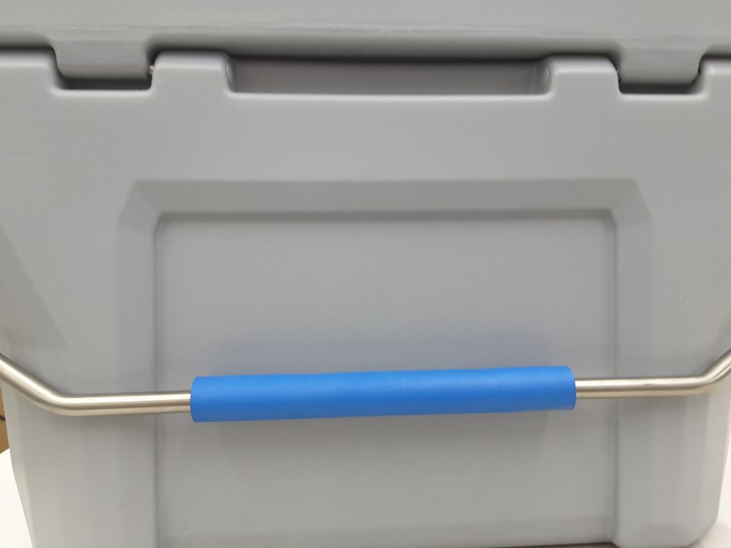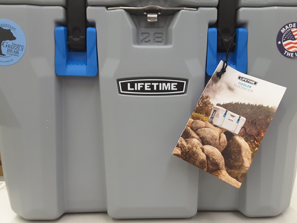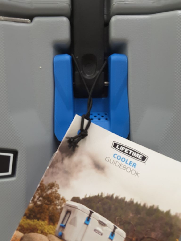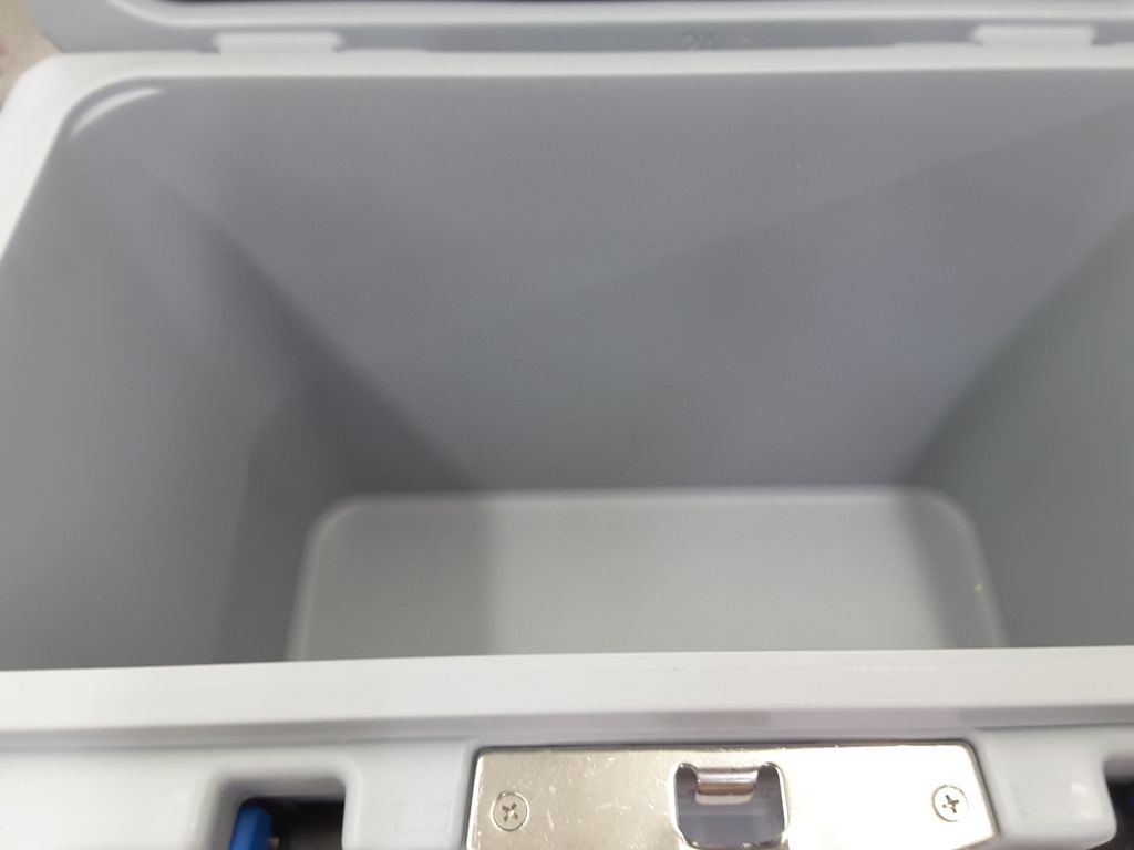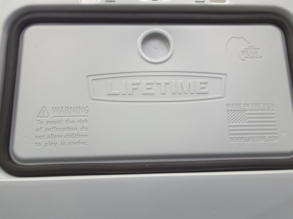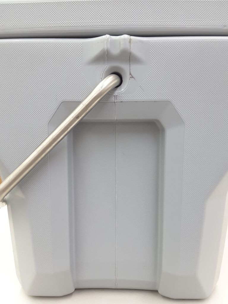 Grey, 90911. Durable, stainless-steel hinge rod. Foam-filled lid with 300-lb distributed weight capacity. Heavy-duty polyethylene construction. Injection over-molded feet with slide guard. Stainless-steel bottle opener with padlock compatibility.