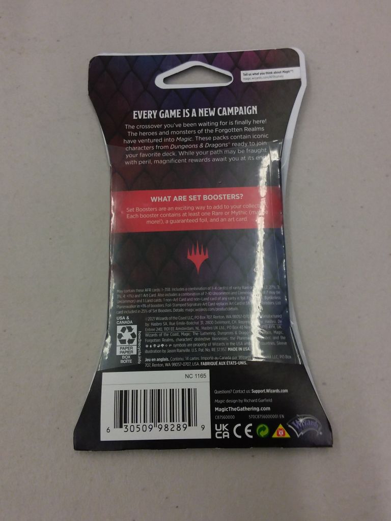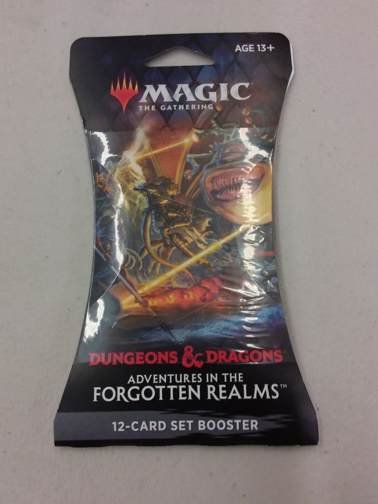 The Adventures in the Forgotten Realms Set Booster pack contains 12 Magic cards, 1 Art Card, and 1 token, ad card, or special card from Magic's history (a card from "The List"). Each pack contains a combination of 1–4 Rares or Mythic Rares, 7–10 Uncommons and Commons (maximum of 7 may be Uncommon), and 1 Land card. One non–Art Card and non–Land card of any rarity is a traditional foil. A foil-stamped Signature Art Card replaces the Art Card in 5% of Set Boosters. A card from The List replaces the token or ad card in 25% of Set Boosters.