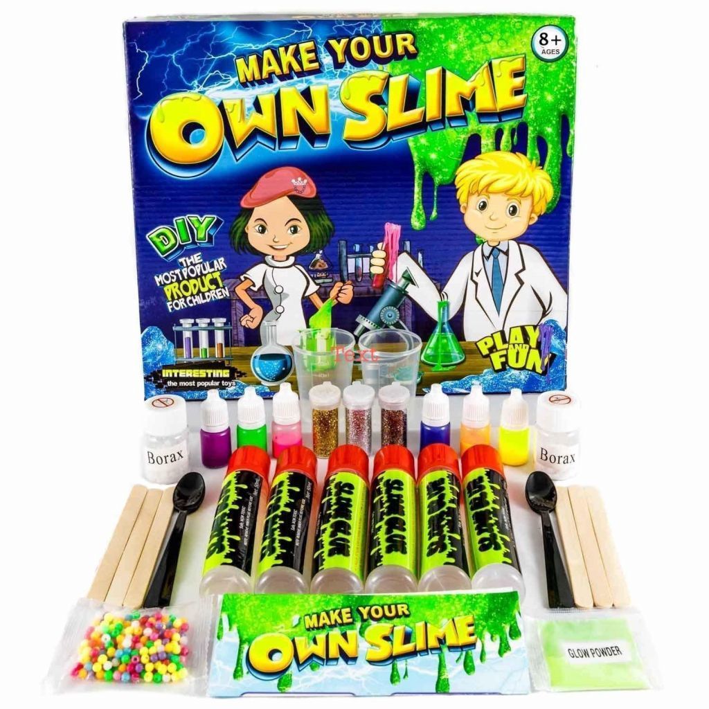 Kit to make slime for boys and girls. DIY kit with everything to make 8 batches of slime. Glitter foam beads with clear glue, neon colors. Slime Supplies Kits
