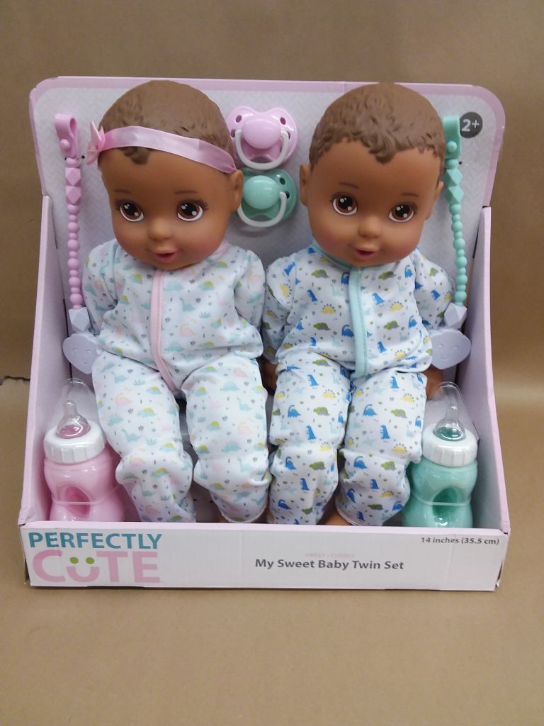 Double the cuteness with matching twins! Each twin wears a matching set of dinosaur printed onesies Each twin comes with a matching milk bottle, pacifier, and pacifier clip