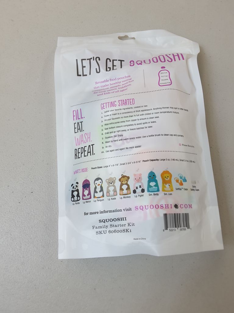 6 Large Pouches (4" x 6-7/8", Capacity 5 oz.) 2 Small Pouches (3-3/4 x 6-5/16", Capacity 3.4 oz.) 2 SoftSip Caps, 4 Extra Safety Caps.