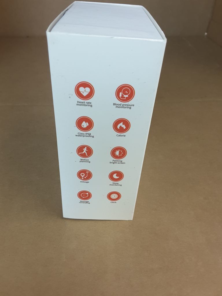 Heart Rate Monitor, Blood Pressure Monitor, Class IP68 Waterproofing, Calorie Counter, Motion Planning, Palming Bright Screen, Mileage, Sleep Monitoring, Message Reminding, and Clock and Date.