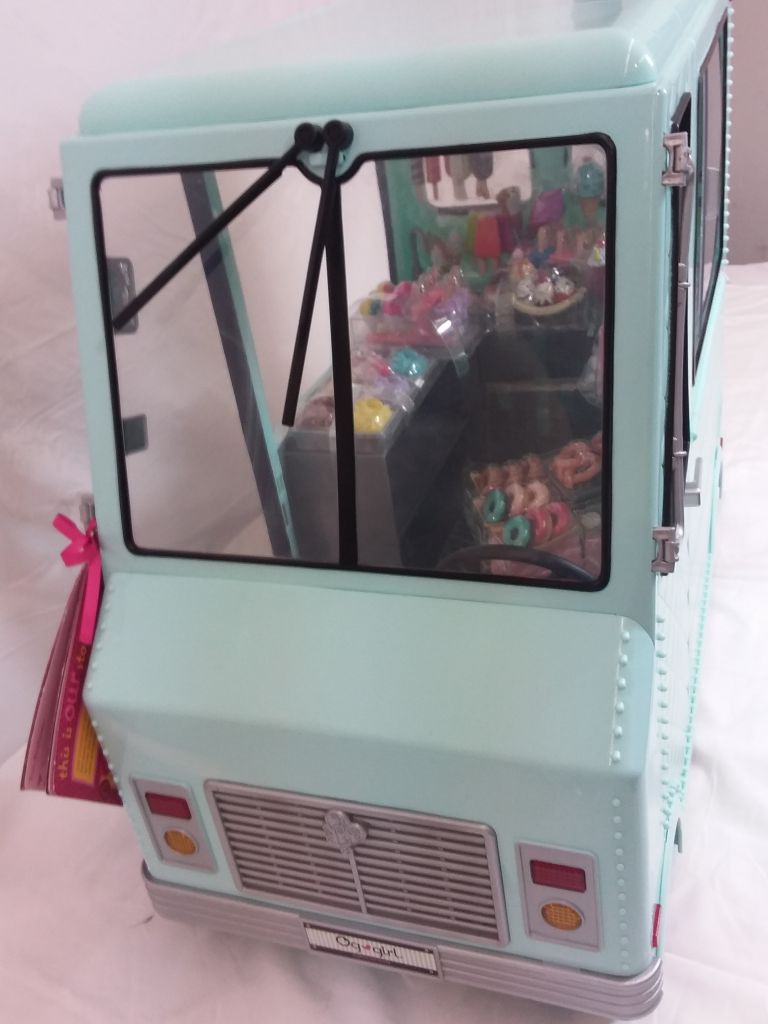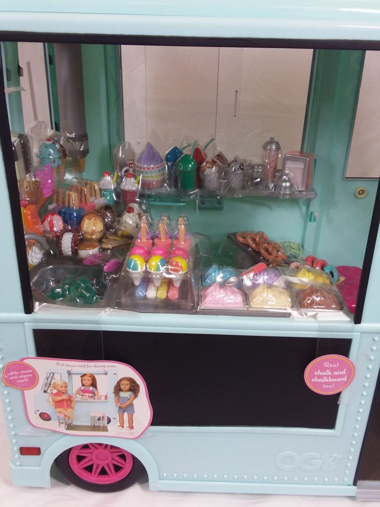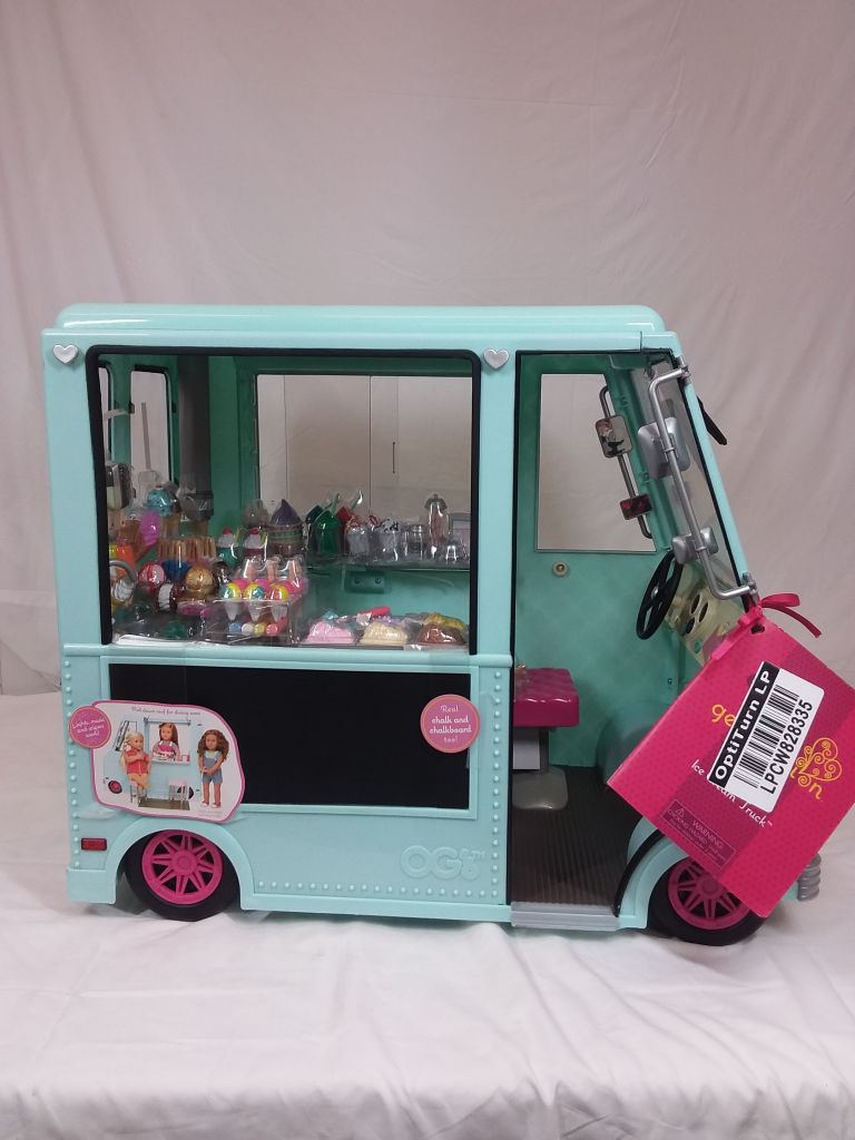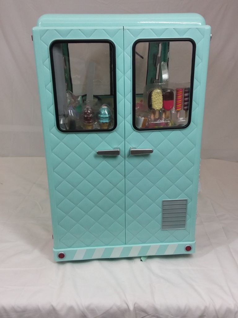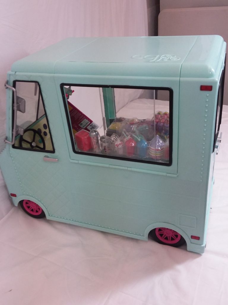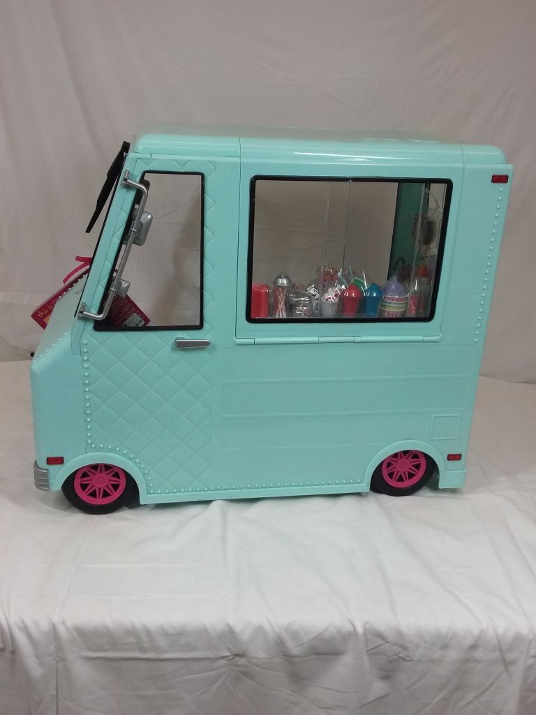 Toy ice cream truck includes ice cream toy accessories dolls not included batteries not included.