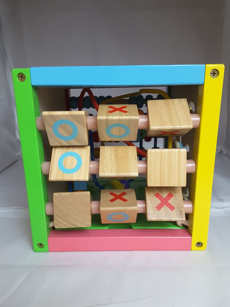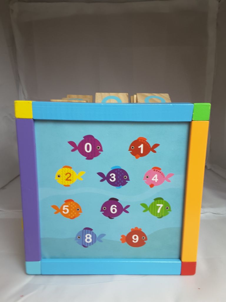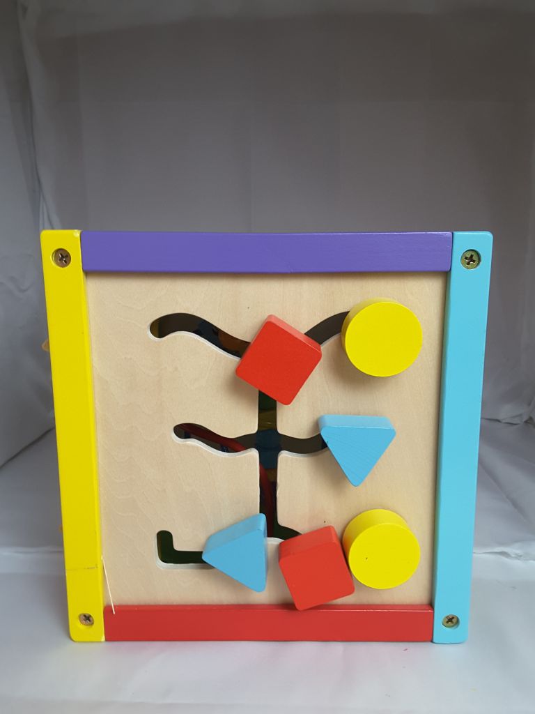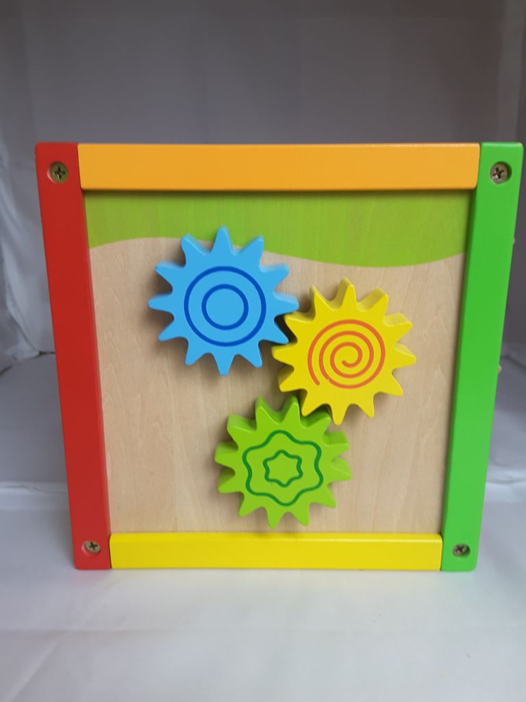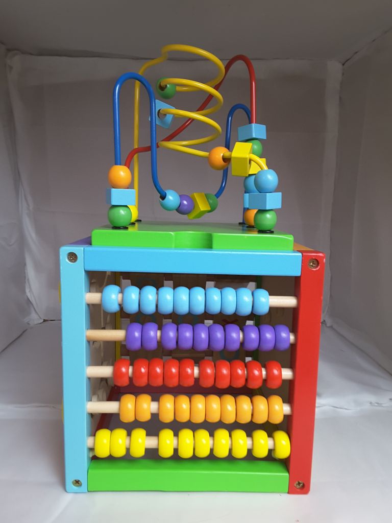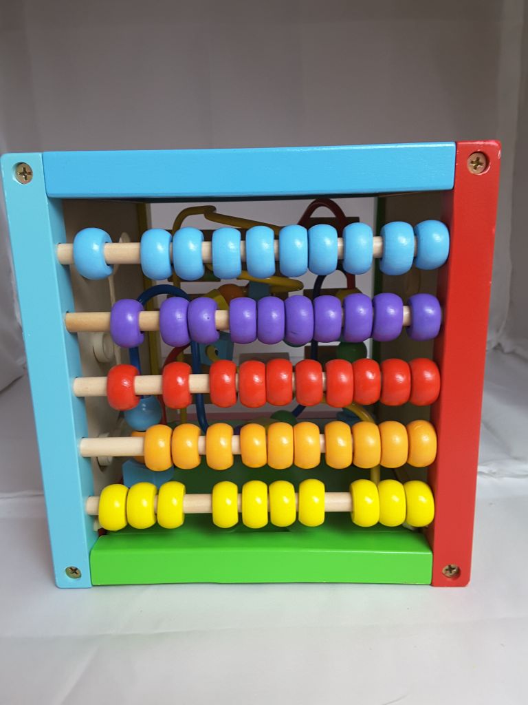 6 Sided Including Counting, Gears, Abacus, tic tac Toe, Block Track and 3 Different Bead Play Options. Removable Bead and Wire Playtop can be used Separately and Tucks into the Cube for Easy Storage.