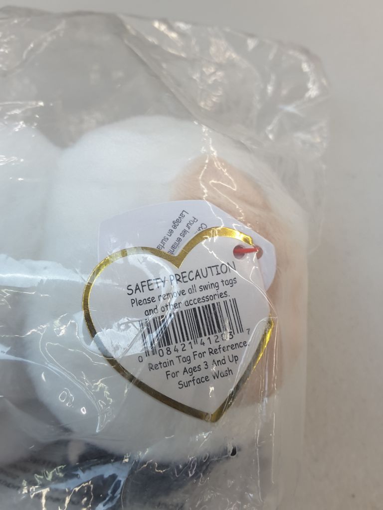 Date of Birth: April 17. Approximate Size: 6 ". Inside Tag Reads: I really love my big black spot. It looks just like a polka dot.