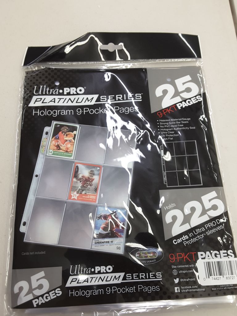 Ultra Pro platinum series hologram 9 pocket pages, 25 pocket pages. Holds 255 cards, UV protection, lays flat, acid free, and ultra clear