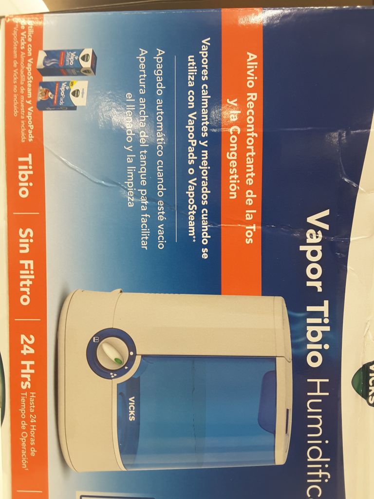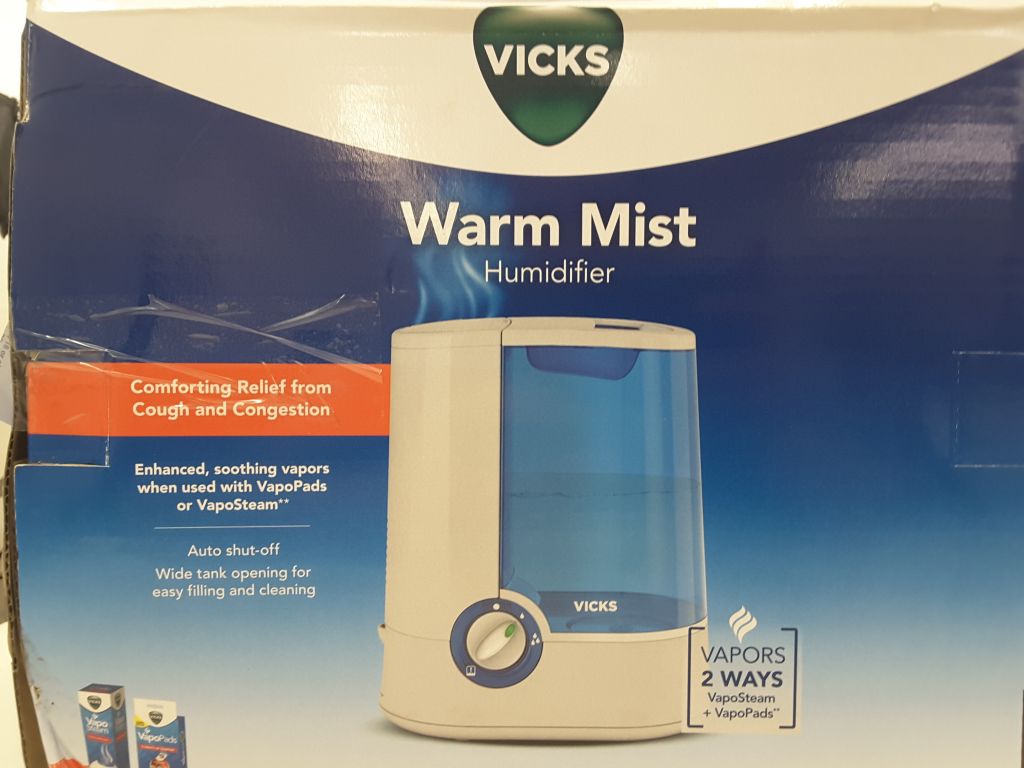 Integrated scent pad heater for use with Vicks Vapo Pads. Medicine cup for use with liquid inhalants such as Vicks VapoSteam or Kaz Inhalant. Vicks Moisture Humidifier has 2 output settings. Filter-free operation. Auto shut off when empty. Tank handle for easy carrying and filling. Quiet operation. Warm mist humidifier has a 1-gallon tank capacity. Runs up to 24 hours per fillings. Large tank opening for easy cleaning. Removable dishwasher-safe parts. Vicks V750 releases visible vapor to help temporarily relieve cough and congestion. Ideal for dry air conditions, during allergy season or when sick.